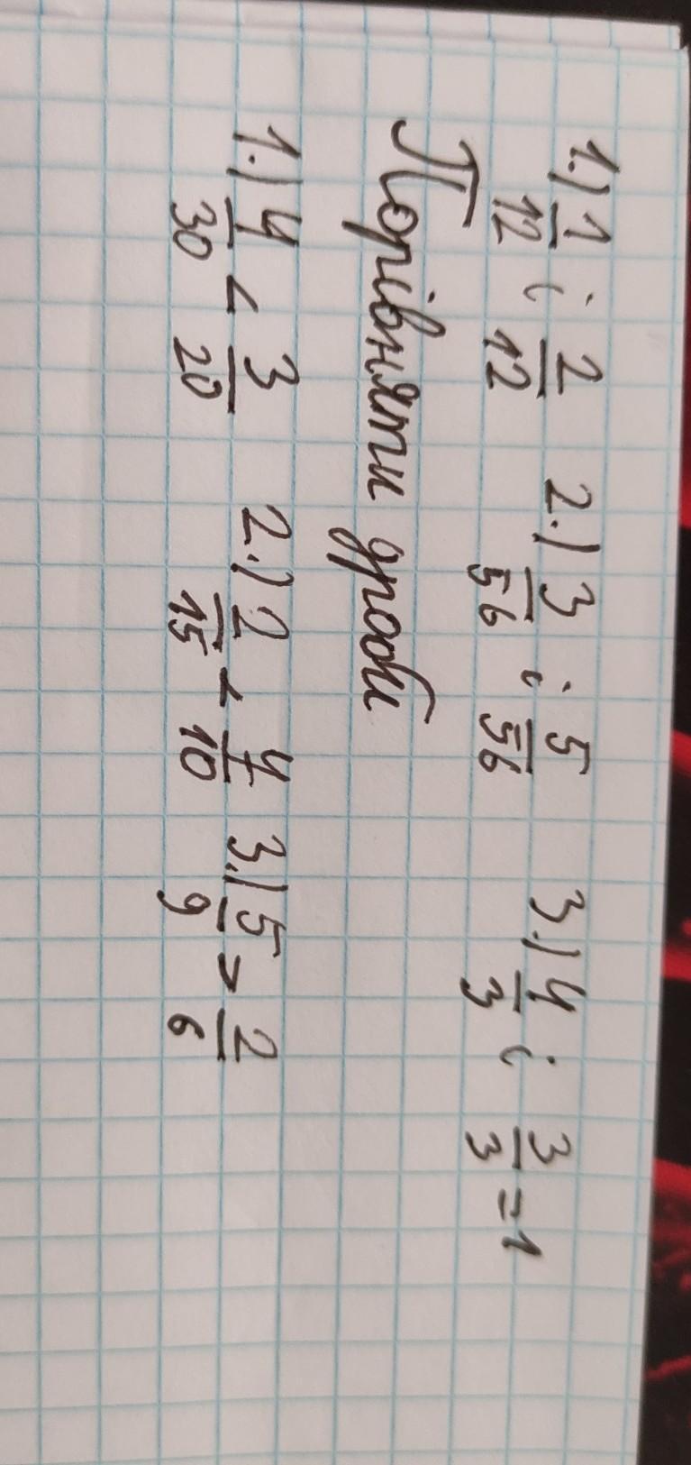 Ответ:1) 4 * 3 = 12 1/12 і 2/12 2)7*8 = 56 8*7 = 56 3/56 і 5/56