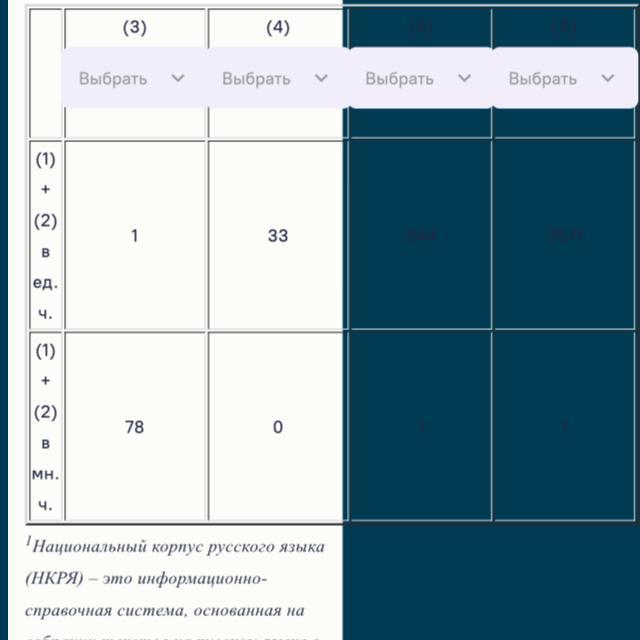 Ниже в таблице приведены данные о том, сколько раз в НКРЯ1 встретились конструкции «предлог (1) + существительное (2) в В. п. + N». Существительное (2) может выступать в конструкции как в единственном, так и во множественном числе. На месте N могут выступать, например, следующие языковые единицы: