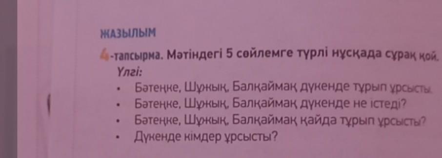 ЖАЗЫЛЫМ 4-тапсырма. Мәтiндегi 5 сөйлемге түрлі нұскада сұрақ қой. Үлгі: . . Бәтенке, Шужык, Балкаймак дүкенде тұрып урсысты Бәтеңке, Шұжык, Балкаймак дүкенде не iстедi? Бәтенке, Шужык, Балқаймақ қайда тұрып ұрсысты? Дүкенде кімдер ұрсысты?