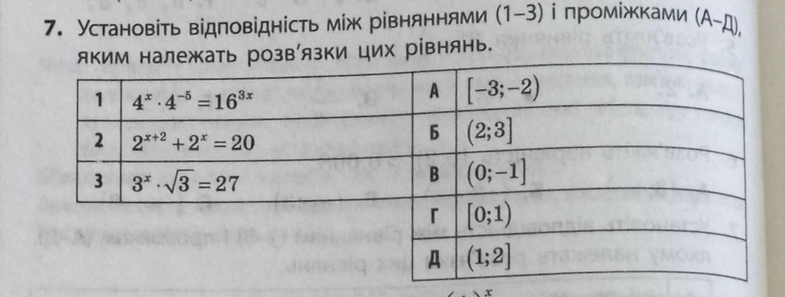 Установіть відповідність між рівняннями (1-3) і проміжками (А-Д), яким належать проміжки цих рівнянь.
