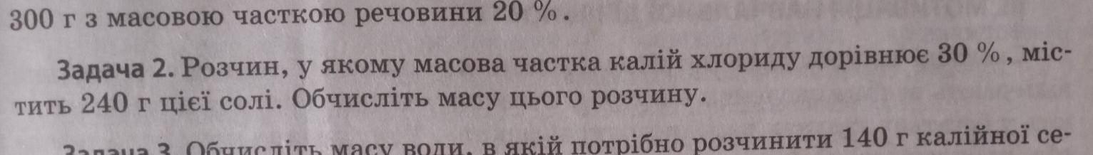 Задача 2. Розчин, у якому масова частка калій хлориду дорівнює 30 %, мiс- тить 240 г цiєї солі. Обчисліть масу цього розчину.