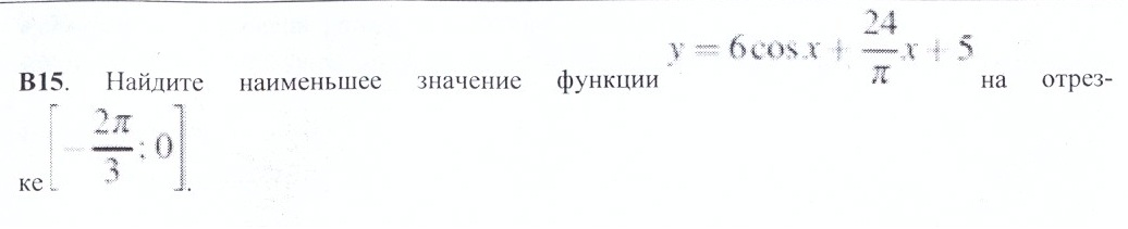 -6sinx+24/pi=0/(6) -sinx=-4/pi sinx=4/pi но пи=3.14 4.3.14>1 sinx<1 =>критических точек нет ,ищем минимум на отрезке [-2pi/3 ,0] на этом отрезке функция cosx убывает , поэтому min (y) будет в левой точке т. е. -2пи/3