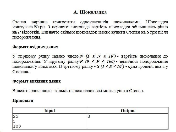 N = int(input("Введіть вартість шоколадки до подорожчання: "))