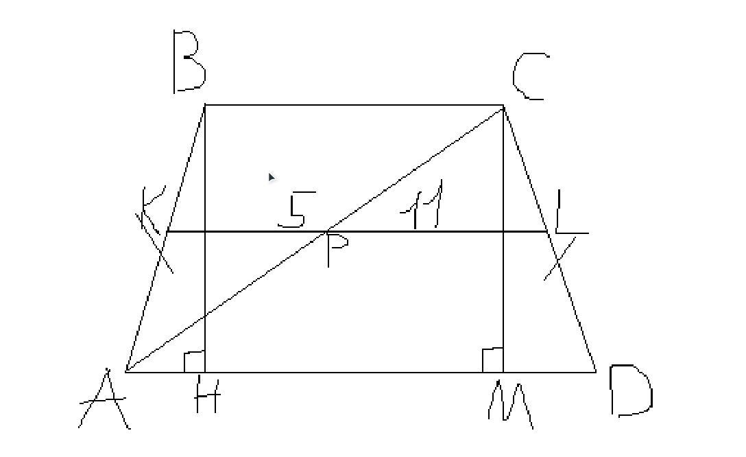 KL=KP+PL=5+11=16(cm) Оскільки KL-середня лінія трапеції,то вона дорівнює півсумі основ. BC+AD=KL*2=32 AD=32-10=22