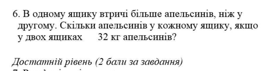 смотри чувак для начала тебе нужно взять один ящик как X другой ящик как 3X потому что в 3 раза больше дальше У тебя выходит 4x и тебе надо 32/4 это выходят в 8 то есть один икс у тебя равно 8 значит в одном ящике 8 кг в другом ящике 8 x 36 то есть 24 кг