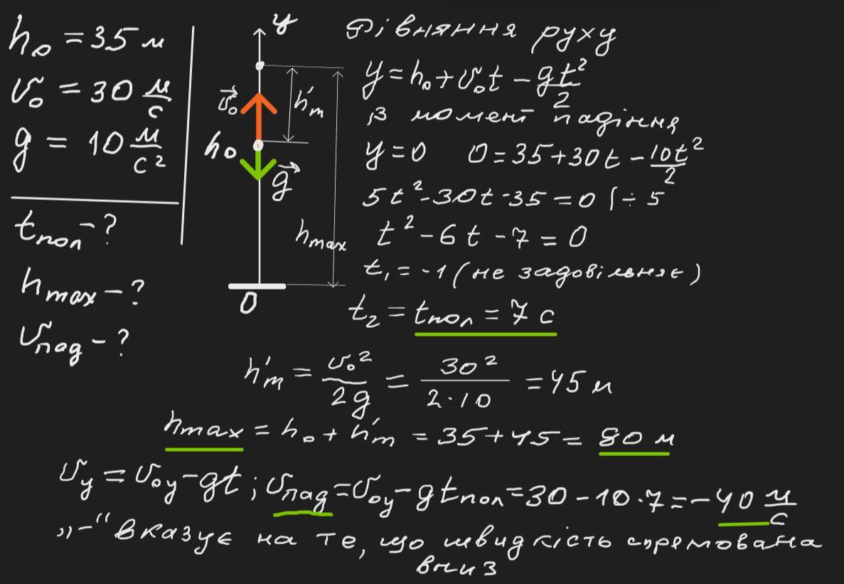 Тіло кинуто вгору з висоти h 0 =35 м зі швидкістю v 0 =30 м/с. Знайдіть: