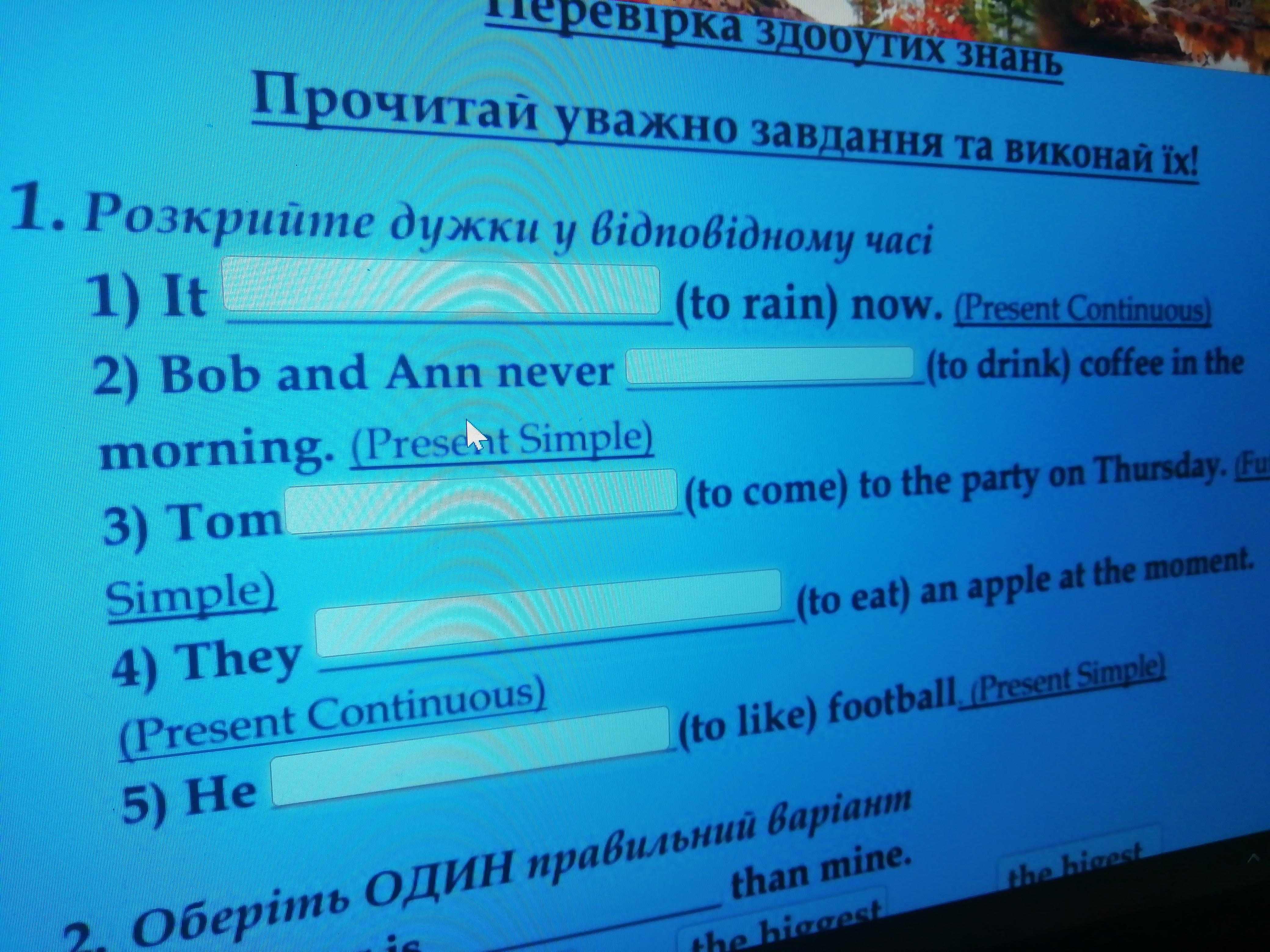 Ответ:1)is raining 2) drink 3)came 4)are eating