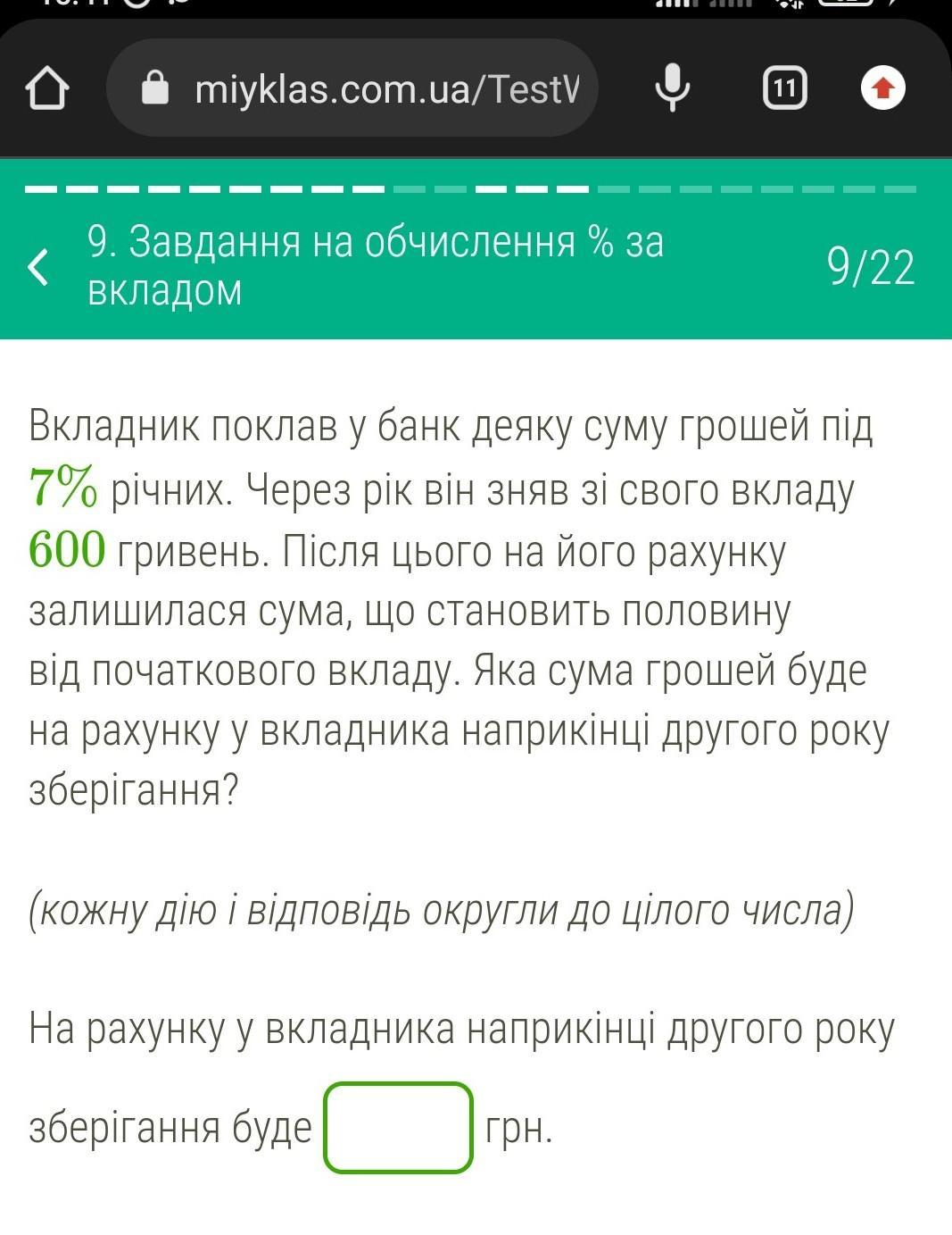 Вкладник поклав у банк деяку суму грошей під 7% річних. Через рік він зняв зі свого вкладу 600 гривень. Після цього на його рахунку залишилася сума, що становить половину від початкового вкладу. Яка сума грошей буде на рахунку у вкладника наприкінці другого року зберігання?