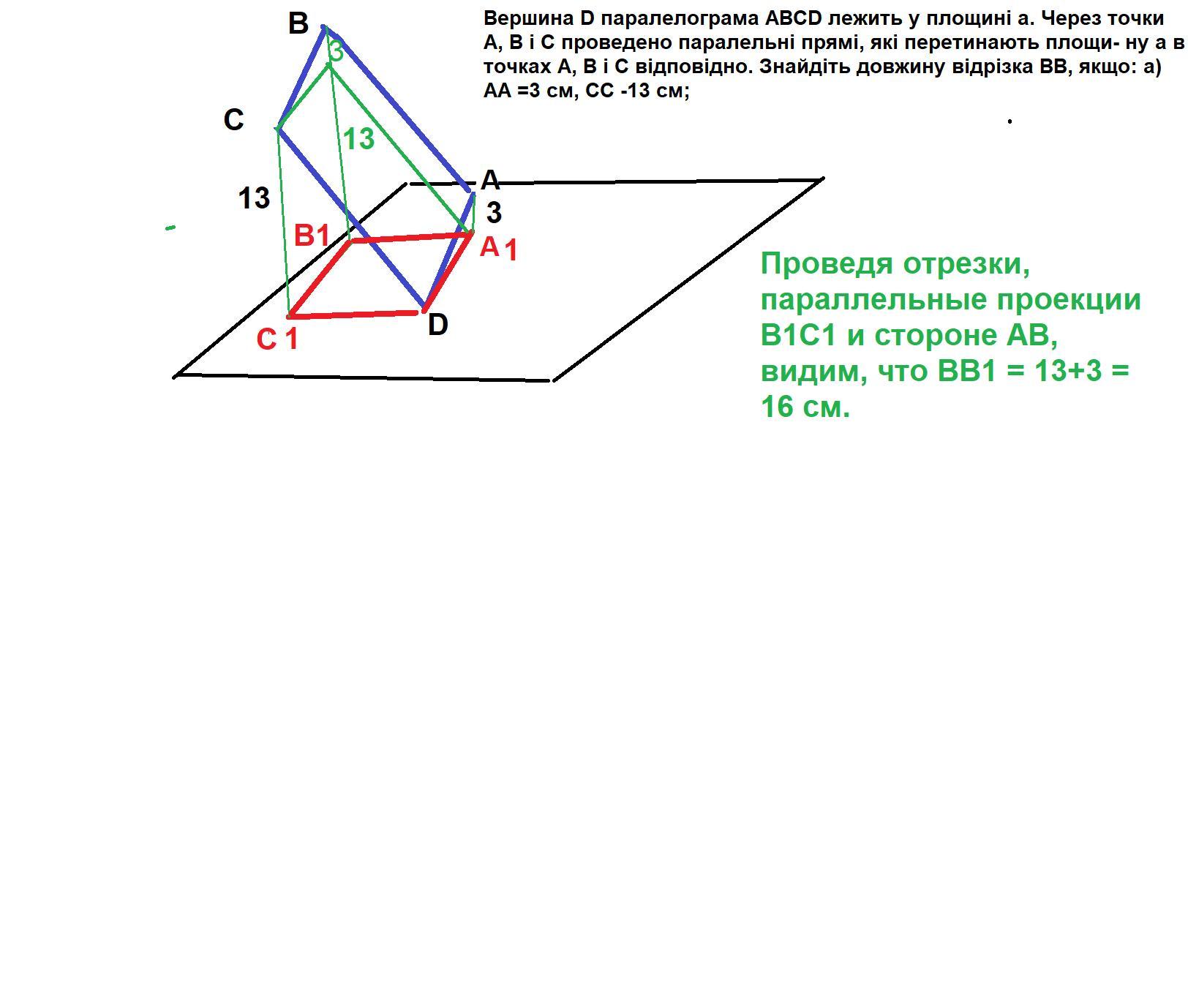 Вершина D паралелограма ABCD лежить у площині а. Через точки А, В і С проведено паралельні прямі, які перетинають площи- ну а в точках A, B і C відповідно. Знайдіть довжину відрізка BB, якщо: AA =3 см, СС -13 см;
