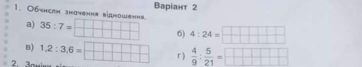 Обчисли значення відношення (просто не верю что в 6 классно умножение) а) 35 : 7 б)4 : 24 в) 1,2 : 3,6 г) 4/9 : 5/21