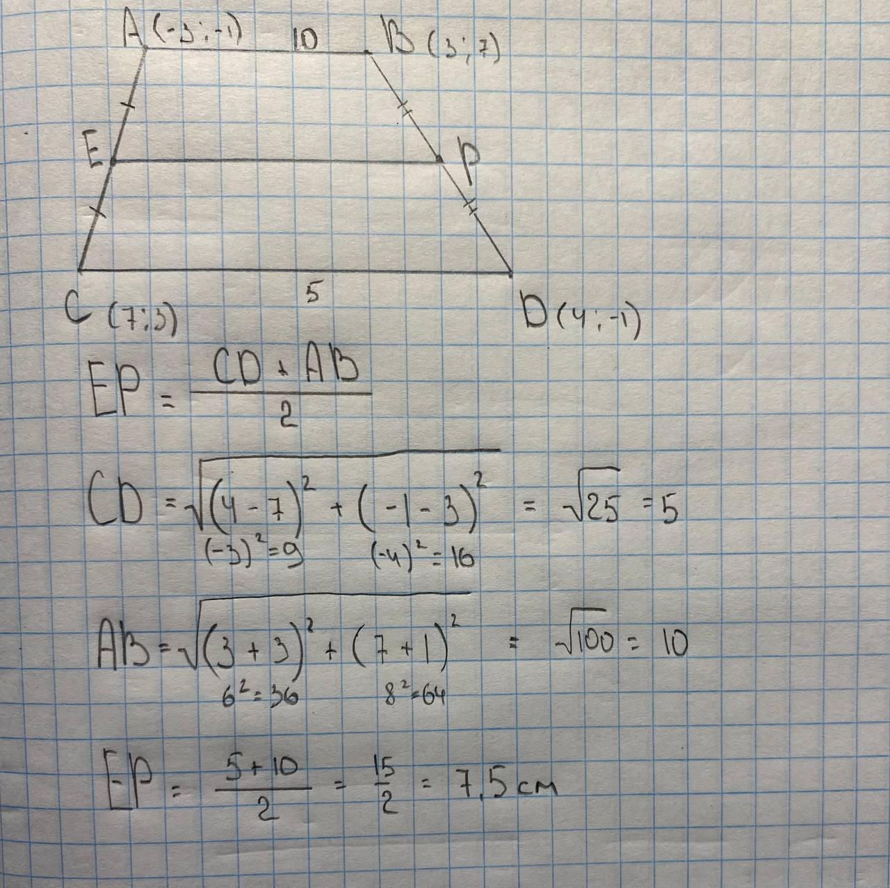 Знайдіть довжину середньої лінії трапеції ABCD (AB|CD), якщо A(-3; -1), B(3; 7), C(7; 3), D(4; -1)