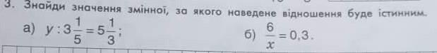 Знайди значення змiнноï, за якого наведене вiдношення буде буде істинним а) y : 3 1/5=5 1/3 б) 6/х = 0,3