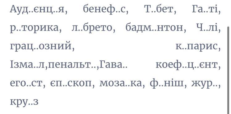 Аудієнція, бенефіст, Тибет, Гаіті, риторика, лібрето, бадмінтон, Чилі, граціозний, кипарис, Ізмаіл, пенальті, Гаваї, коефіцієнт, егоіст, єпіскоп, мозаіка, фініш, журі, круіз.