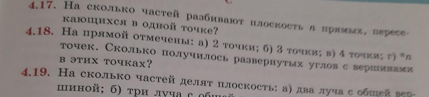 4.18. На прямой отмечены: а) 2 точки; б) 3 точки; в) 4 точки; г) *п точек. Сколько получилось развернутых углов с вершинами в этих точках,