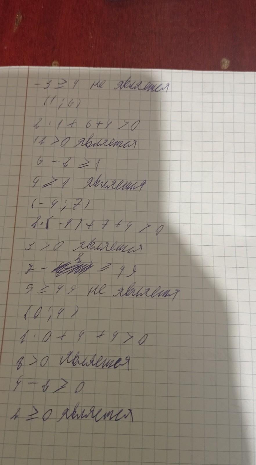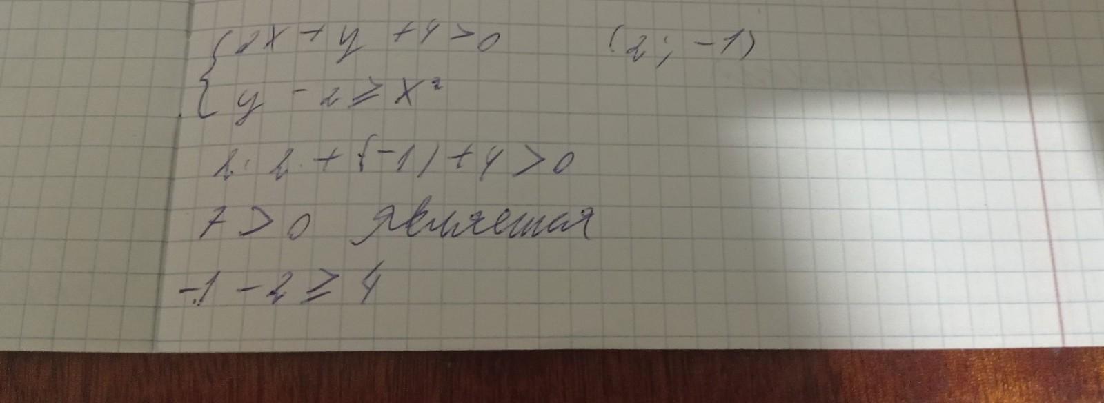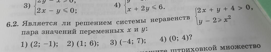 6.2. Является ли решением системы неравенств пара значений переменных х и у: {2x + y +4 > 0, {y-2> x² 1) (2; -1); 2) (1; 6); 3) (-4; 7); 4) (0; 4)?