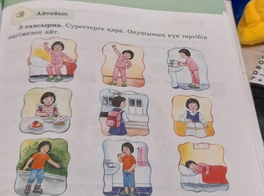 3-тапсырма. Суреттерге қара. Оқушының күн тәртібін эңгімелеп айт. отинем комектесиндерш