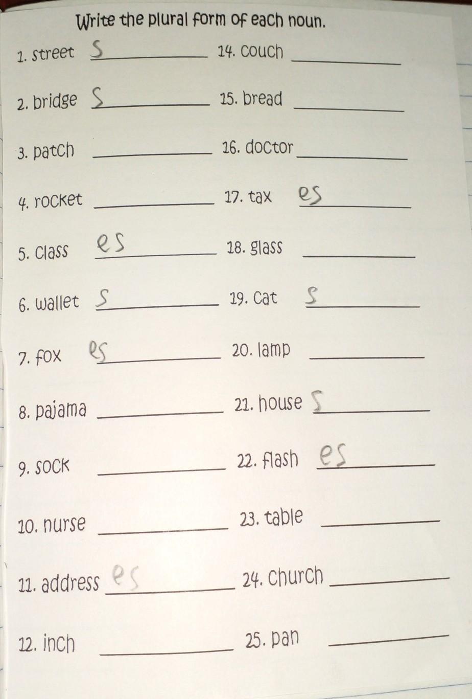 1. Street S 2. bridge S 3. patch 4. rocket 5. Class es 6. wallet S 7. FOX es 8. pajama Write the plural form of each noun. 14. Couch 9. SOCK 10. nurse 11. address es 12. inch 15. bread 16. doctor 17. tax es 18. glass 19. Cat S 20. lamp 21. house S 22. flash es 23. table 11 24. Church 25. pan