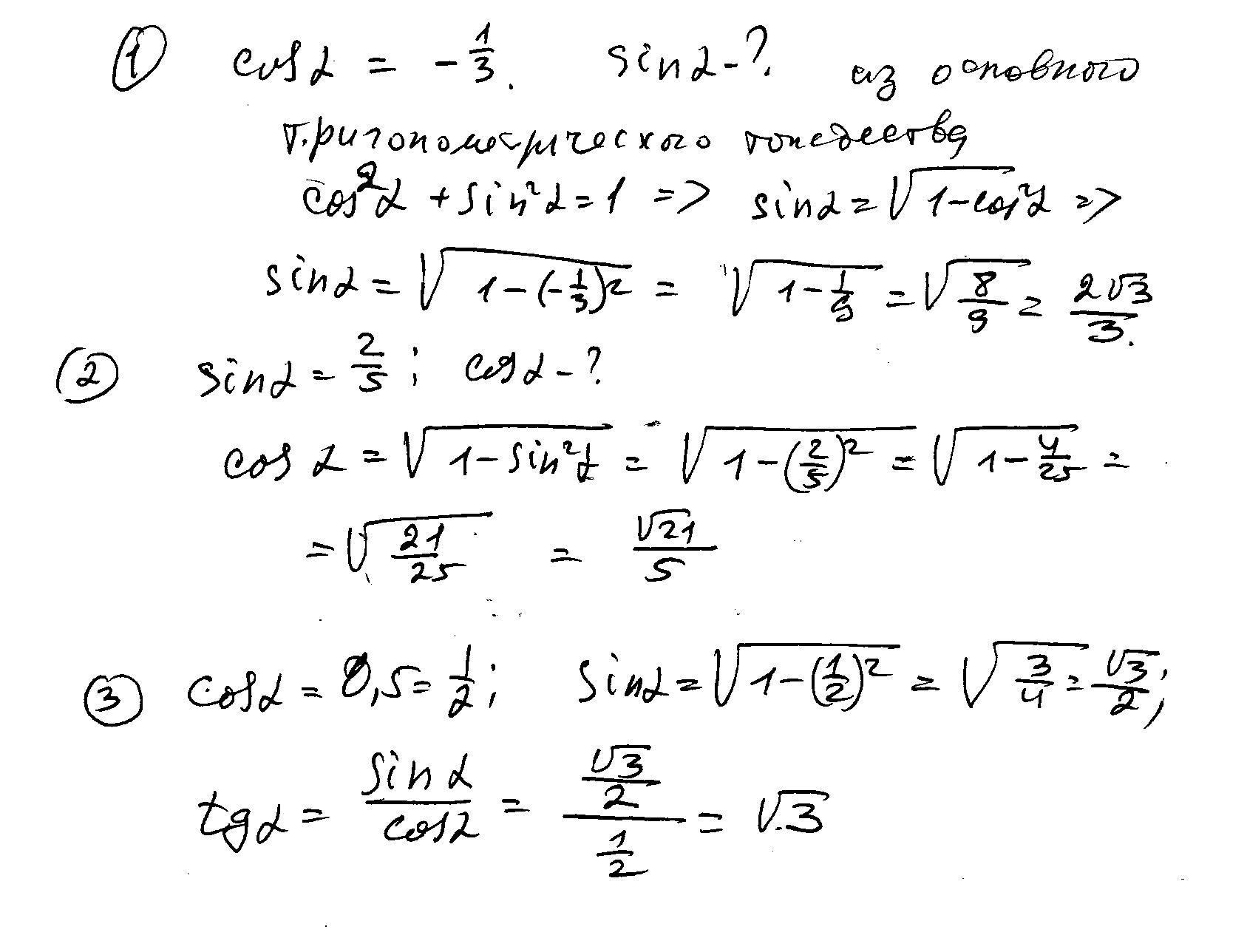 В первой задаче, ввиду того, что не указано в какой четверти задан угол, я решил, что он острый, (в первой четверти), поэтому синус угла будет положительным. Если угол задан в третьей или четвертой четверти, то синус этого угла будет отрицательным . То же самое и для остальных задач - по конкретному условию определите знак вычисленной функции.