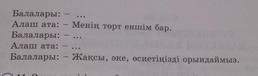 10. Мәтін мазмұнына сәйкес сұхбатты толықтыр.алаш Ата - улдарым, оздерынды шыкырган себебым мен сендерге еншы берейын деп отырымын