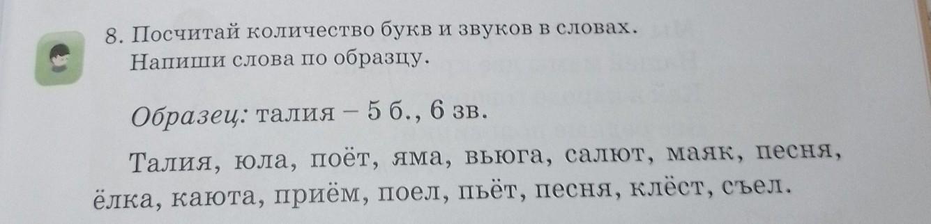 8. Посчитай количество букв и звуков в словах. Напиши слова по образцу. Образец: талия – 5 б., 6 зв. Талия, юла, поёт, яма, вьюга, салют, маяк, песня, ёлка, каюта, приём, поел, пьёт, песня, клёст, съел. срочно завтра мне надо рано просыпаться срочно пожалуйста заранее спасибо)