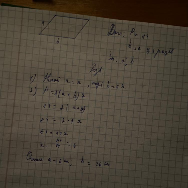 Знайдіть сторони паралелограма, периметр якого дорівнює 84 см, а одна із сторін у 6 разів більша від іншої.