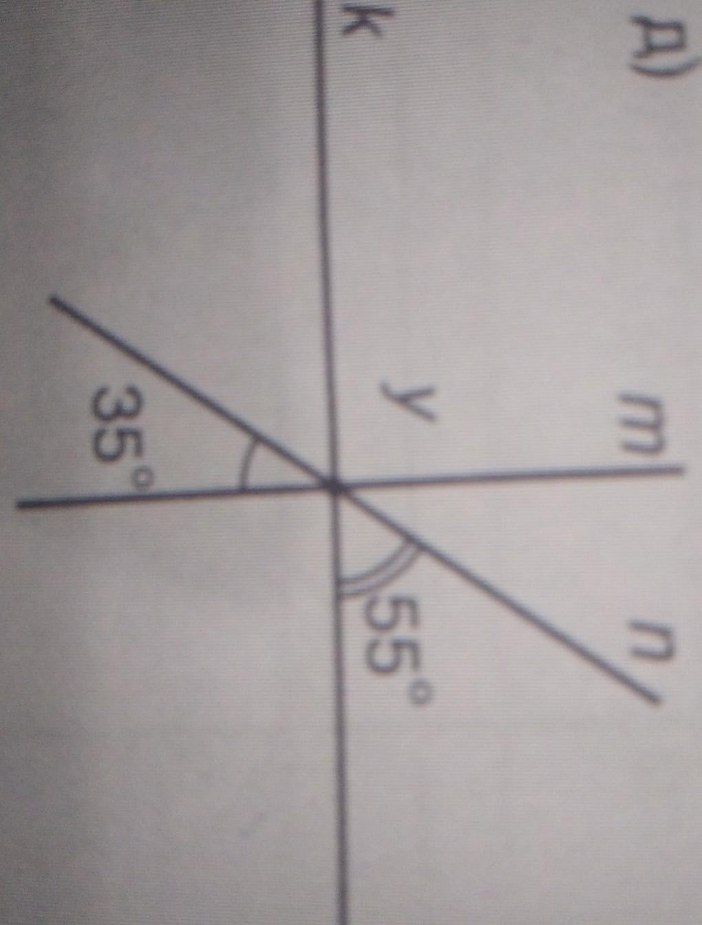 сума суміжних кутів дорівнює 180°, тому 180°-(35°+55°)=90°. у дорівнює куту 90° як вертикальні