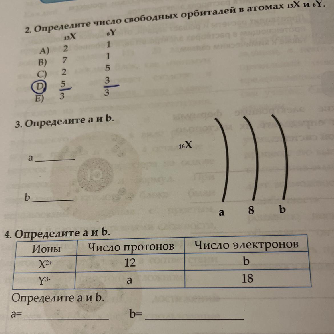 в третьем дано в-во X с количеством электронов 16, на первом электронном слое может быть максимум два электрона, на втором написано, сложив получим десять, и тогда понятно что на третьем электронном слое шесть штук, итого 16 как и было указано. В 4, количество протонов ровно количеству электронов, ион X стоит с зарядом +2, следовательно он передал два электрона, с Y наооборот, у него стоит -3, что говорит о том что ему дали электрон другие вещества, всего кол-во электронов 18, а на кол-во протонов заряд не влияет, он остается как был, 18-3=15