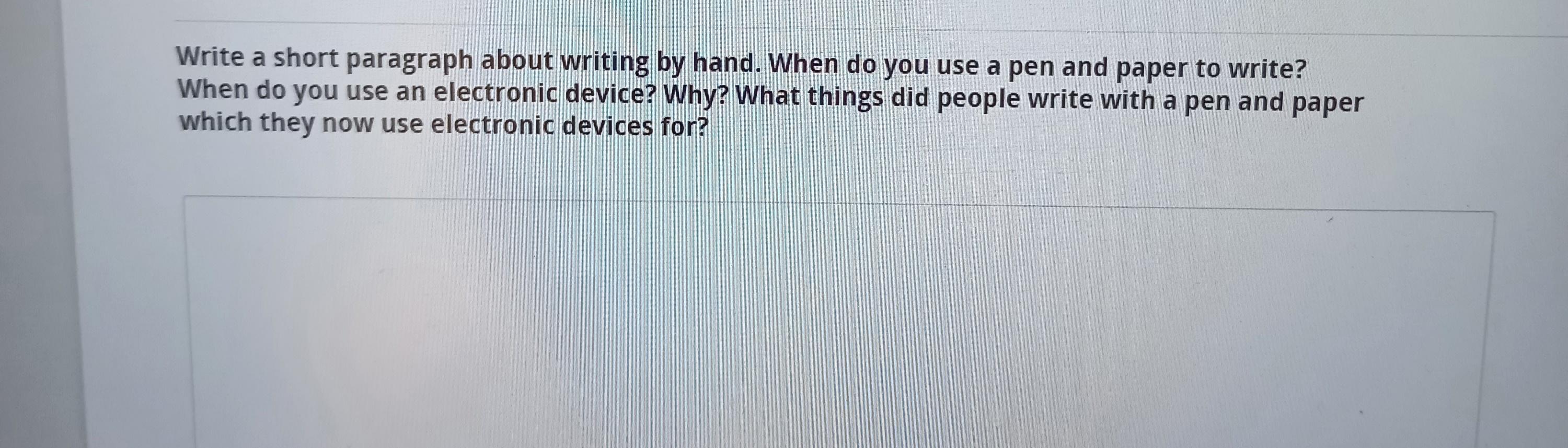 В наши дни люди используют ручку и бумагу намного меньше, чем раньше. Мы по-прежнему пишем на бумаге записки в школе и дома, но предпочитаем использовать телефоны для отправки сообщений друзьям и родственникам. Каких-то 30 лет назад люди писали письма ручкой на бумаге. Сейчас мы очень редко пишем традиционные 'длинные" письма; вместо них у нас электронная почта. А причина проста: электронная почта намного быстрее, что очень важно, потому что и жизнь у нас быстрая