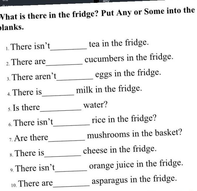 Ответ: 1. Any, 2. Some, 3. An, 4. Any, 5. Any, 6 some, 7 Some, 8 Any, 9 any,10