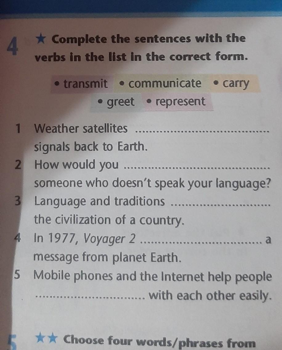 4 * Complete the sentences with the verbs in the list in the correct form. • transmit • communicate • carry • greet represent 1 Weather satellites signals back to Earth.