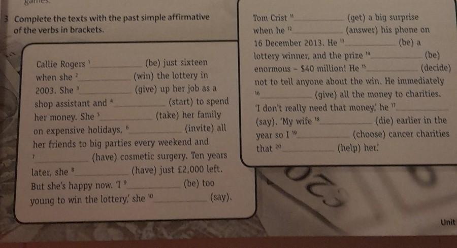 Відповідь: 1. were 2. won 3. gave 4. started 3. took 4. invited 5. had 6. had 7. was 10. said 11. got 12. answered 13. was 14. was 15. dicided 16. got 17. said 18. died 19. choosed 20. helped