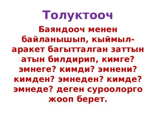 Кимге? Эмнеге? Кимди? Эмнени? Кимден? Эмнеден? Кимде? Эмнеде?