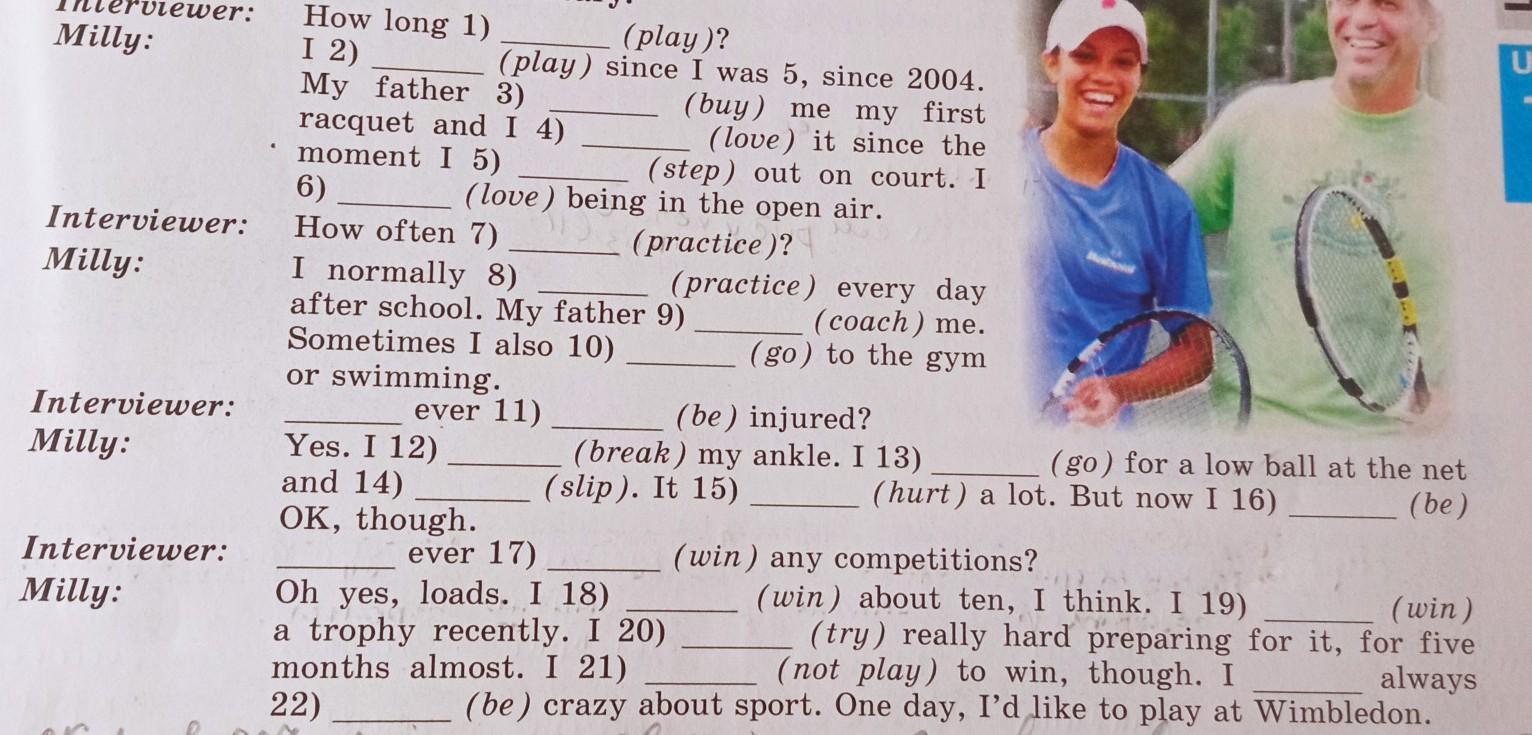 Прочитайте интервью с юной теннисисткой Милли Дэвис, используйте слово в скобках, чтобы дополнить каждое предложение правильным временем. Возможно более двух времен. При необходимости обратитесь к банку грамматик.