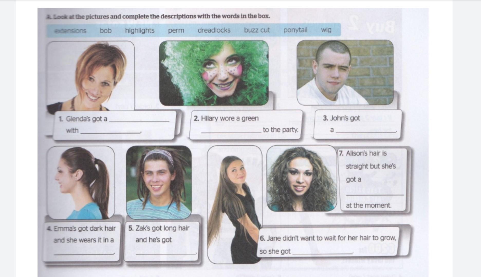 A Look at the pictures and complete the descriptions with the words in the box. extensions bob highlights perm dreadlocks buzz cut 1. Glenda's got a with 4. Emma's got dark hair and she wears it in a 5. Zak's got long hair and he's got 2. Hilary wore a green ponytail to the party. wig S vua 3. John's got a 7. Alison's hair is straight but she's got a at the moment. 6. Jane didn't want to wait for her hair to grow, so she got
