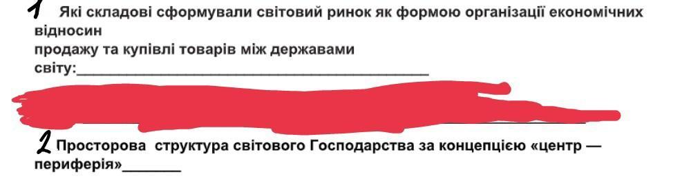 2)«ЦЕНТР-ПЕРИФЕРІЯ». У світі виділяють менто - розвинені країни світу, які оточені напівпериферією, де одночасно розвинені окремі види послуг і промислового виробництва (наприклал. вилобування нафти та послуги авіаперевезень в ОАЕ). У розвинених країнах світу розташовані переважно штаб-квартири міжнародних організацій і транснаціональних корпорацій (ТНК). У цих країнах досягнуто найвищих показників соціально-економічного розвитку. Найчисельнішою є група країн світу на периферії. Ці країни мають міжнародну спеціалізацію одному-двох видах економічної діяльності (наприклад. Еквадор вирощує