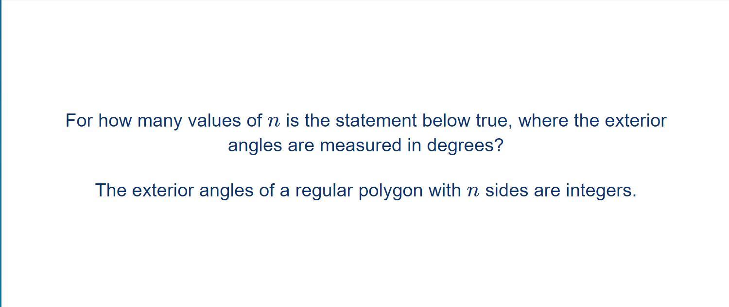 22 правильных многоугольника имеют целые внешние углы.
