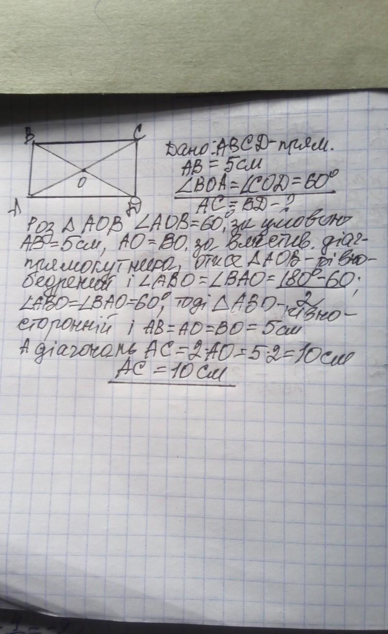 3. Меньшая сторона прямоугольника равна 5 см, диагонали пересекаются под углом 60º. Найдите диагональ прямоугольника. Teamempus
