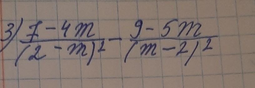(2-m)²=(m-2)²,поэтому это выражение можно записать:(7-4m)/(2-m)²-(9-5m)/(2-m)²=(7-4m-9+5m)/(2-m)²=(m-2)/(m-2)²=1/(m-2)