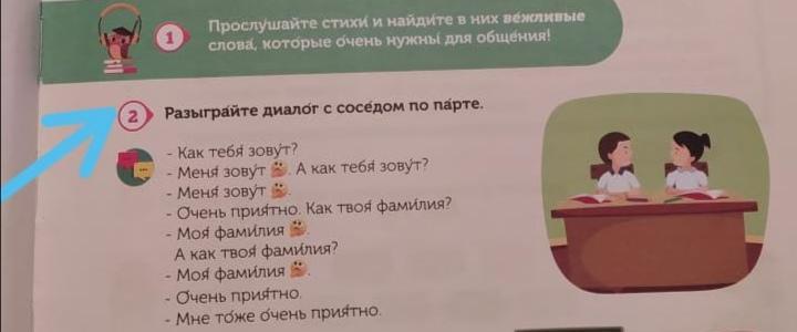 просто надо выучить/прочитать с соседом и вставить на месте смаилика имя/фамилию
