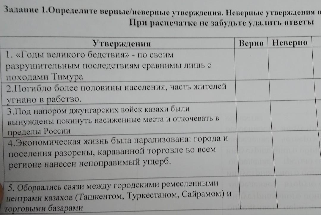 Задание 1.Определите вные/неверные утверждения. Неверные утвержд При распечатке не забудьте удалить отв Верно Невер Утверждения 1. Годы великого бедствия» - по своим разрушительным последствиям сравнимы лишь с походами Тимура 2.Погибло более половины населения, часть жителей угнано в рабство. 3.Под напором джунгарских войск казахи были вынуждены покинуть насиженные места и откочевать в пределы России 4.Экономическая жизнь была парализована: города и поселения разорены, караванной торговле во всем регионе нанесен непоправимый ущерб. 5. Оборвались связи между городскими ремесленными центрами казахов (Ташкентом, Туркестаном, Сайрамом) и торговыми базарами