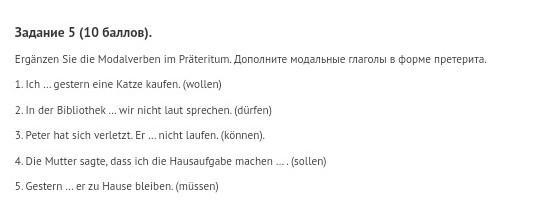 Ergänzen Sie die Modalverben im Präteritum. Дополните модальные глаголы в форме претерита. 1. Ich … gestern eine Katze kaufen. (wollen) 2. In der Bibliothek … wir nicht laut sprechen. (dürfen) 3. Peter hat sich verletzt. Er … nicht laufen. (können). 4. Die Mutter sagte, dass ich die Hausaufgabe machen … . (sollen) 5. Gestern … er zu Hause bleiben. (müssen)