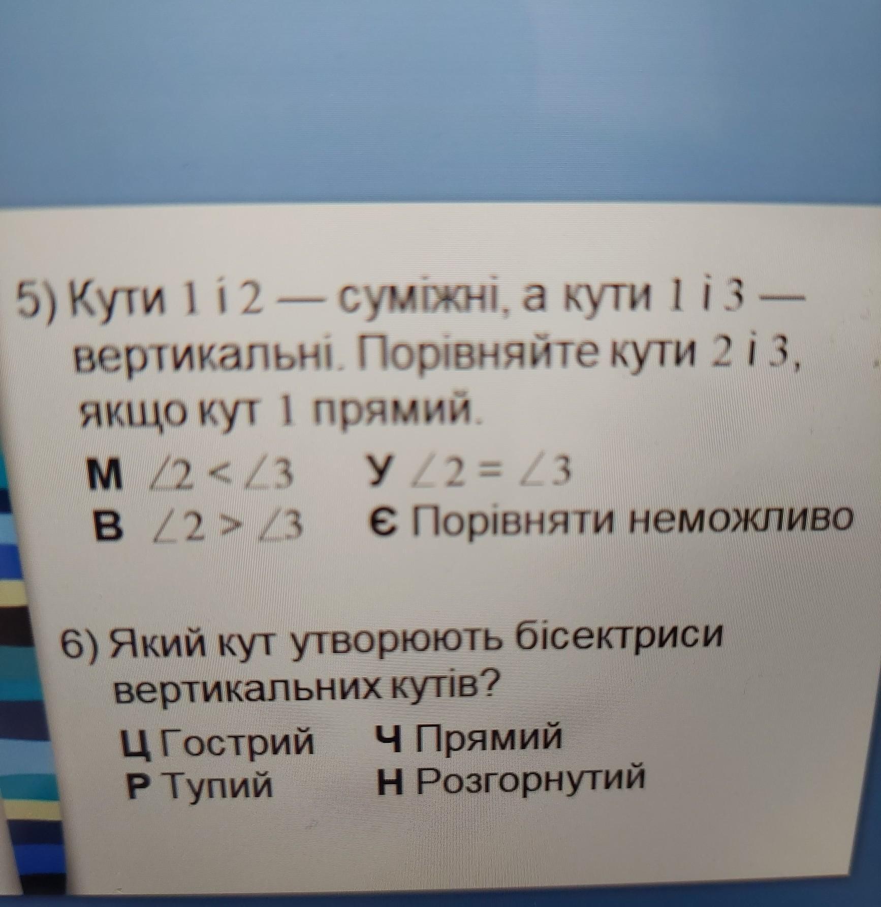 6) Бо вертикальні кути і так гострі або прямі, якщо їх розділити бісектрисою утворюються гострі кути