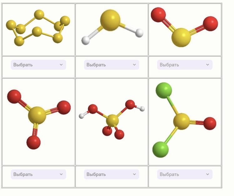 Первое H2S.Ворое S6.Третий So2.Четвертое So3.пятое SOCl2.Шестое SCl2. я сам так сделал.