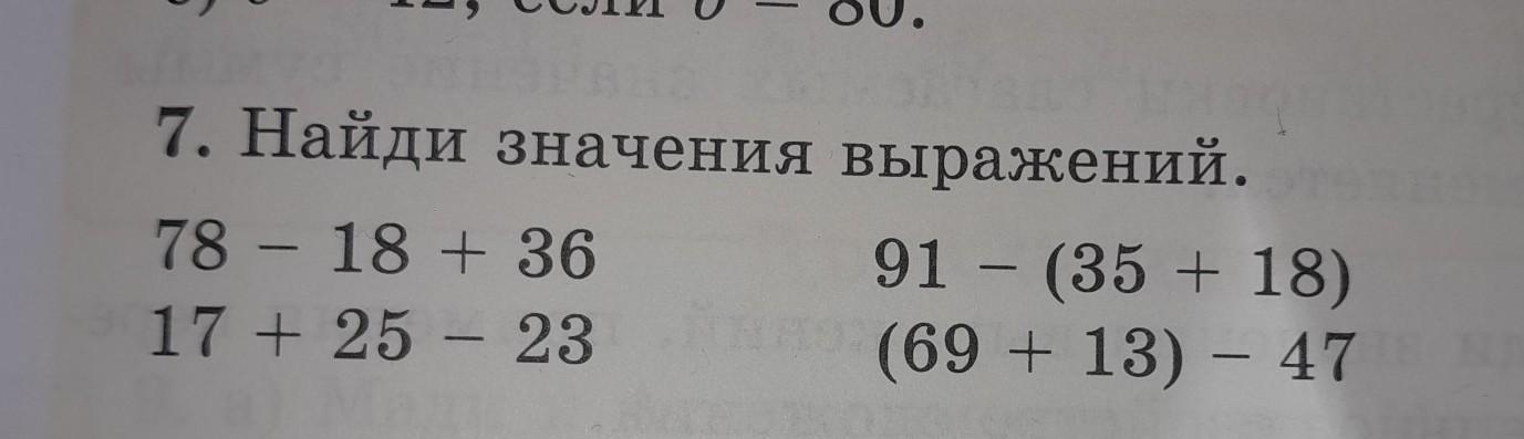 7. Найди значения выражений. 78 - 18 + 36 17 + 25 - 23 91 - (35 + 18) (69+13) - 47 помогите пожалуйста выполнить задание,значения выражения