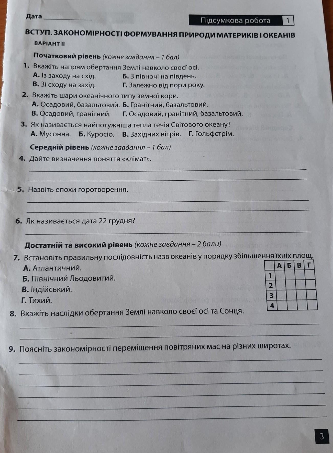 4)Клі́мат — багаторічний режим погоди, який базується на багаторічних метеорологічних спостереженнях, 25-ти — 50-тирічні цикли, одна з основних географічних характеристик тієї чи іншої місцевості.