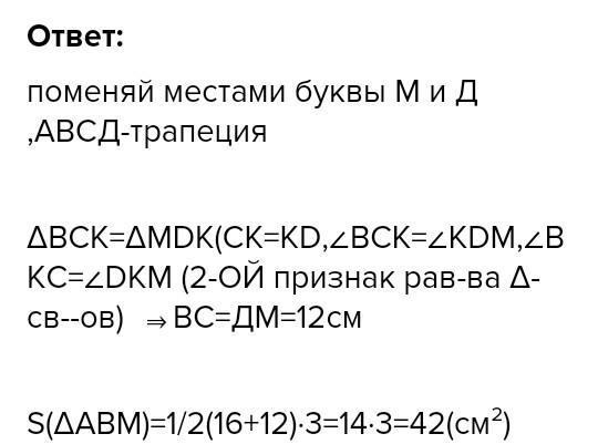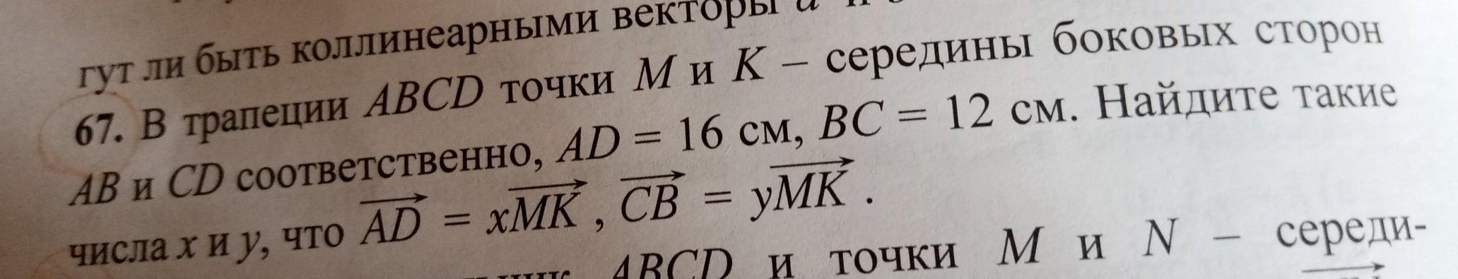 67. В трапеции ABCD точки M и K — середины боковых сторон AB и CD соответственно, AD=16cm, BC=12cm. Найдите такие числа x и y, что ➝AD=x➝MK, ➝CB=y➝MK.