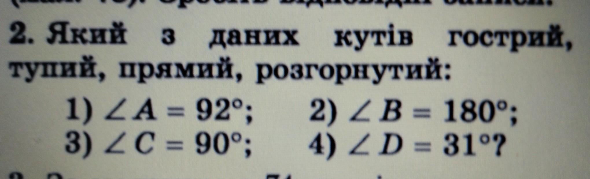 2. Який з даних кутів гострий, тупий, прямий, розгорнутий: