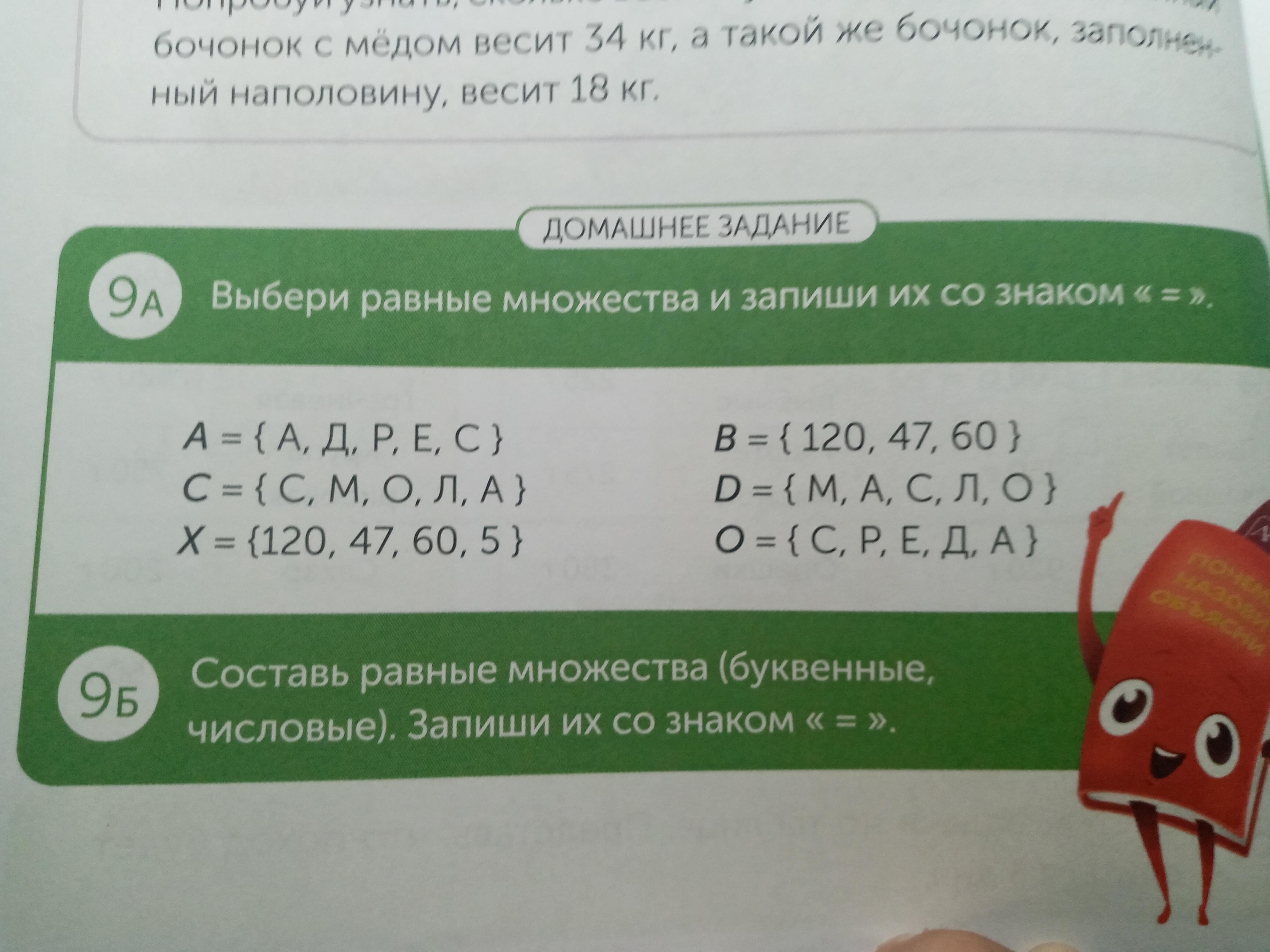 Как видим все элементы множества А принадлежат множеству О : {А,Д,Р,Е,С} и {С,Р,Е,Д,А}, значит А=О