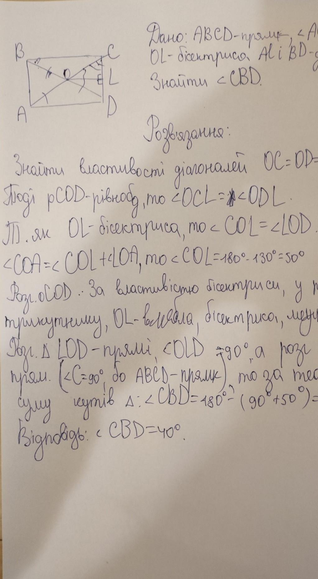 У прямокутнику ABCD діагоналі перетинаються в точці О. ОР бісектриса трикутника АОВ, кут DOP = 130°. Знайдіть кут CAB.
