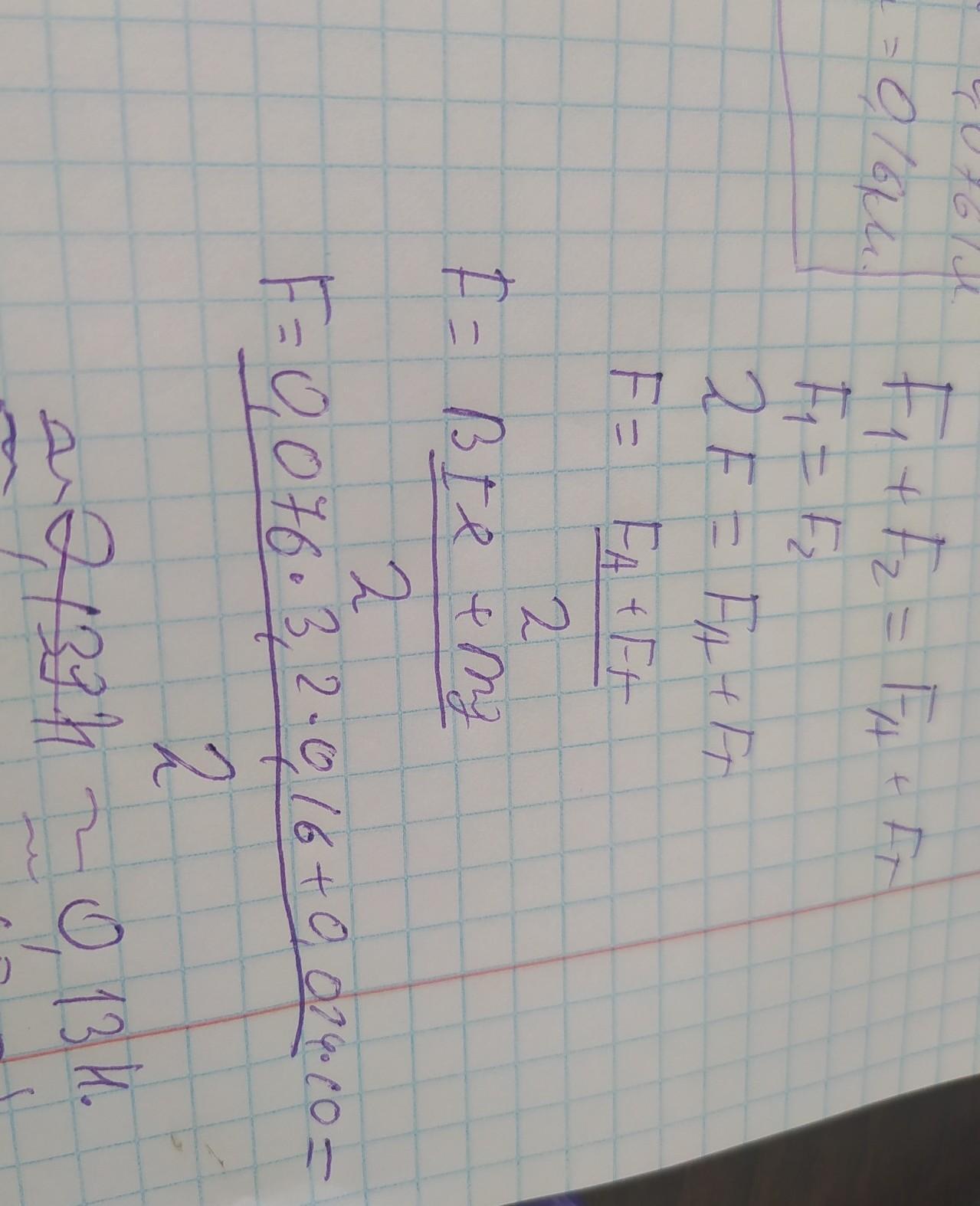Провідник масою 24,4г підвішений на тонких легких нитках і поміщений в однорідне магнітне поле з індукцією 76,1мТл. Довжина провідника 16,1см. Визначте силу натягу кожної нитки при пропущенні по провіднику струму силою 3,2А.Відповідь заокругли до сотих.